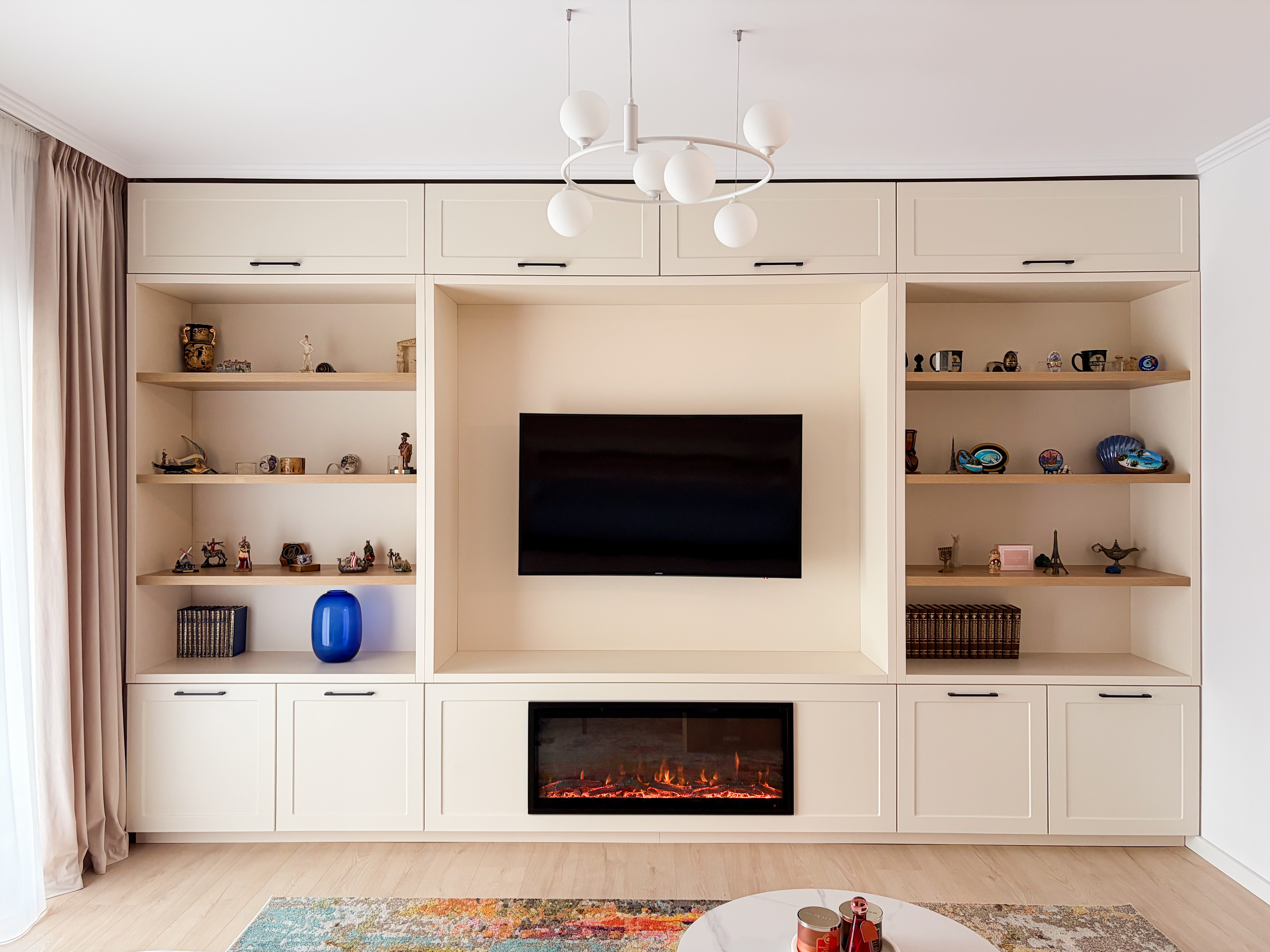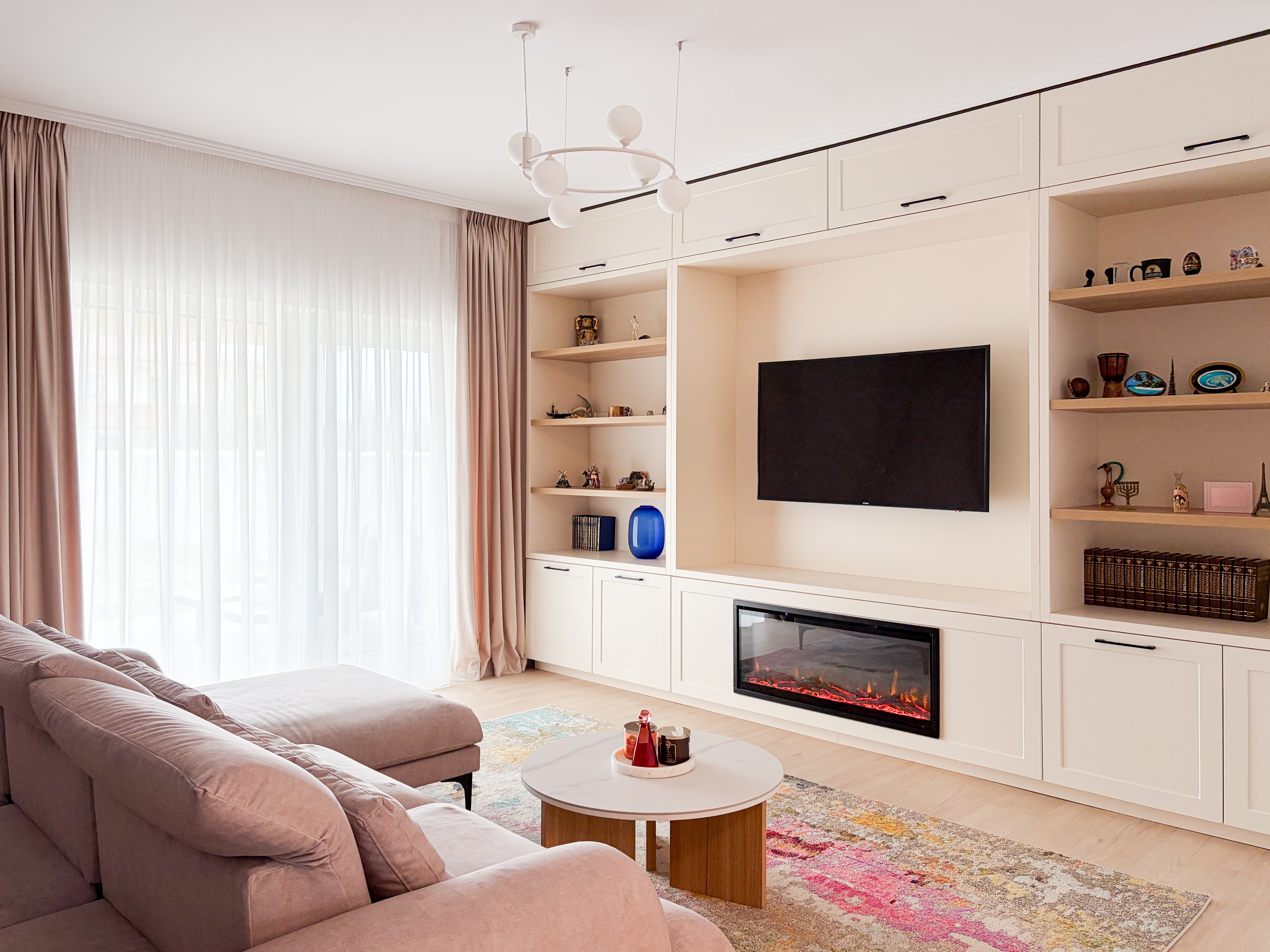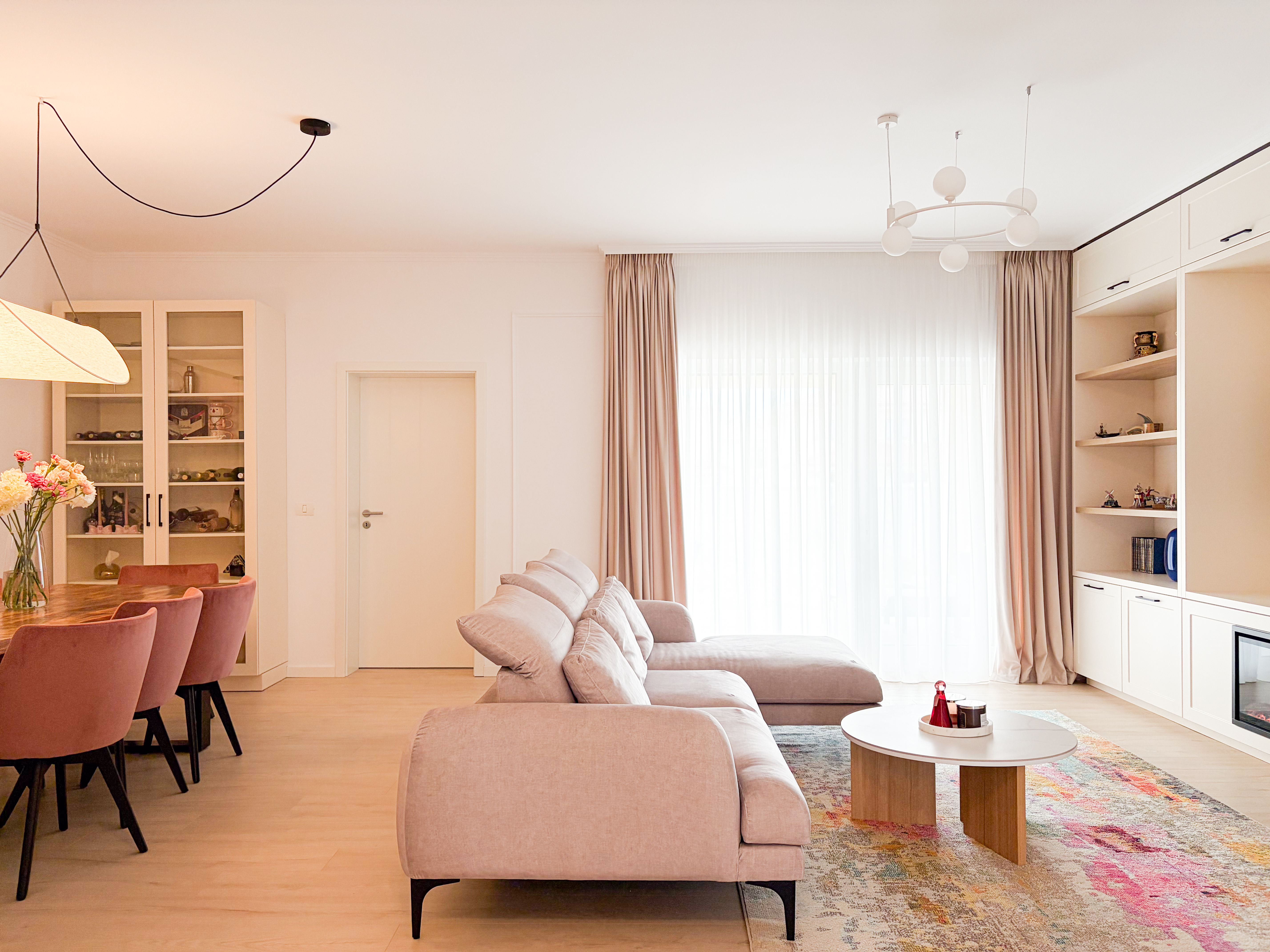 Zona de living și dining au fost concepute ca un spațiu deschis, echilibrat, în care proporțiile generoase definesc experiența locuirii. Paleta cromatică este construită pe tonuri calde și luminoase – nuanțe de crem, bej și blush – completate de accente discrete de culoare care adaugă profunzime și personalitate spațiului. Mobilierul ales respectă proporțiile încăperii, cu volume bine controlate și linii curate, contribuind la o atmosferă aerisită și elegantă. Șemineul electric este elementul central al zonei de living, acesta având atât un rol estetic, cât și unul de confort. Încadrarea sa într-o bibliotecă realizată pe comandă creează un punct de interes vizual, oferind totodată spații de depozitare și expunere atent calibrate. Zona de dining este tratată ca o extensie naturală a livingului, cu o masă din lemn masiv și scaune tapițate în tonuri pudrate, care aduc căldură și echilibru cromatic. Tabloul amplasat pe peretele principal devine un element artistic definitoriu, accentuând paleta cromatică și adăugând un impact vizual puternic, fără a domina spațiul.