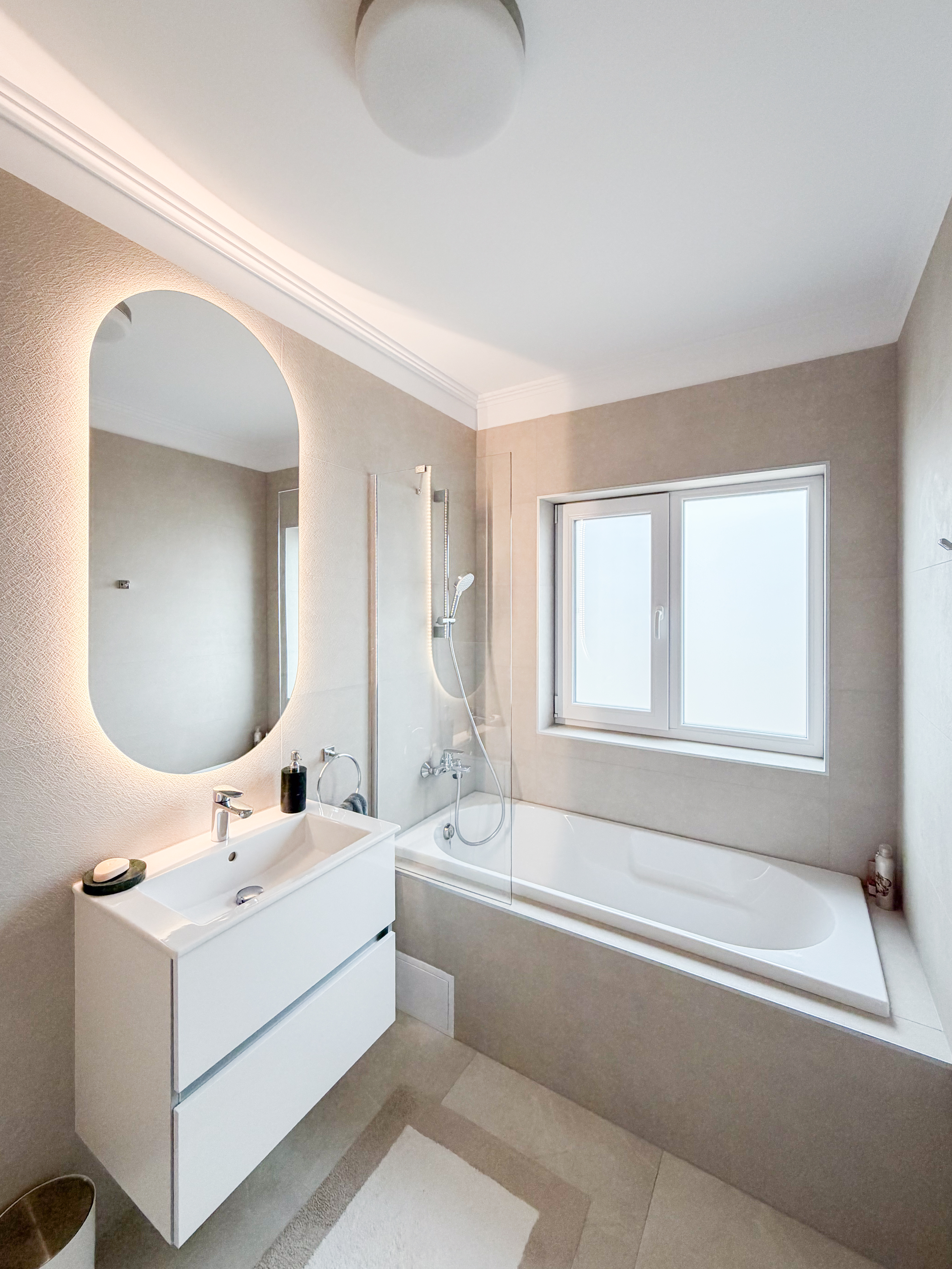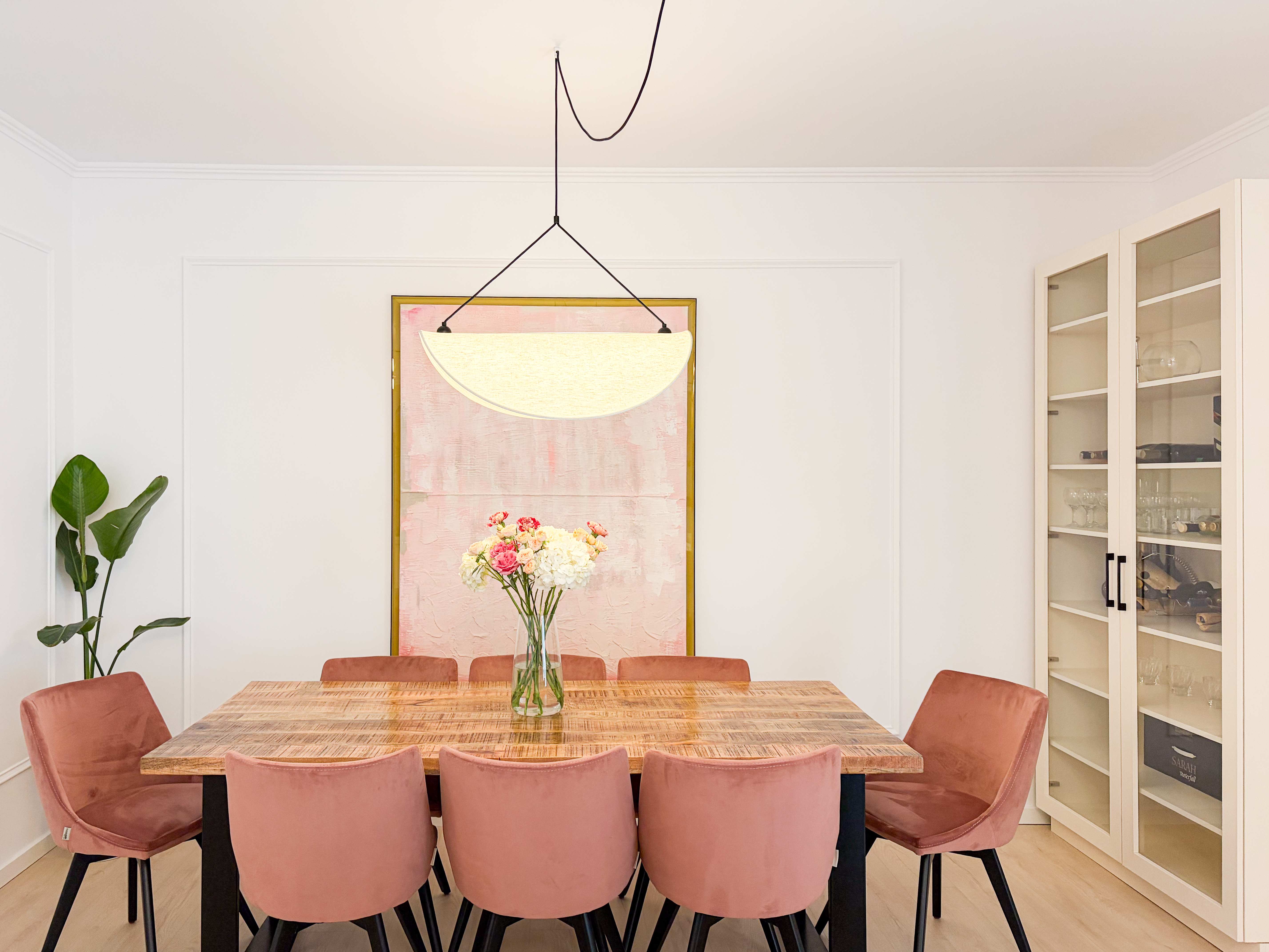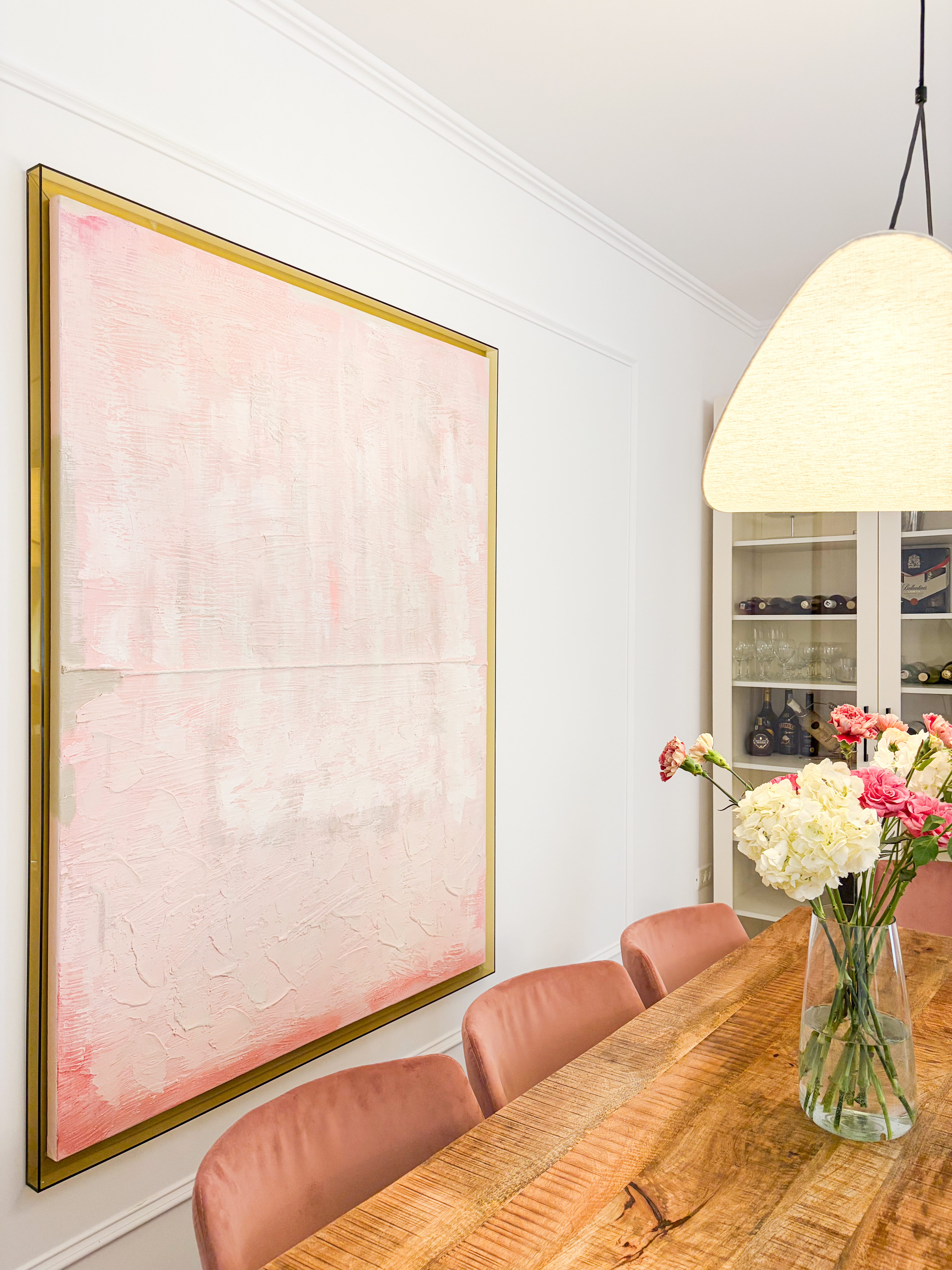Zona de living și dining au fost concepute ca un spațiu deschis, echilibrat, în care proporțiile generoase definesc experiența locuirii. Paleta cromatică este construită pe tonuri calde și luminoase – nuanțe de crem, bej și blush – completate de accente discrete de culoare care adaugă profunzime și personalitate spațiului. Mobilierul ales respectă proporțiile încăperii, cu volume bine controlate și linii curate, contribuind la o atmosferă aerisită și elegantă. Șemineul electric este elementul central al zonei de living, acesta având atât un rol estetic, cât și unul de confort. Încadrarea sa într-o bibliotecă realizată pe comandă creează un punct de interes vizual, oferind totodată spații de depozitare și expunere atent calibrate. Zona de dining este tratată ca o extensie naturală a livingului, cu o masă din lemn masiv și scaune tapițate în tonuri pudrate, care aduc căldură și echilibru cromatic. Tabloul amplasat pe peretele principal devine un element artistic definitoriu, accentuând paleta cromatică și adăugând un impact vizual puternic, fără a domina spațiul.