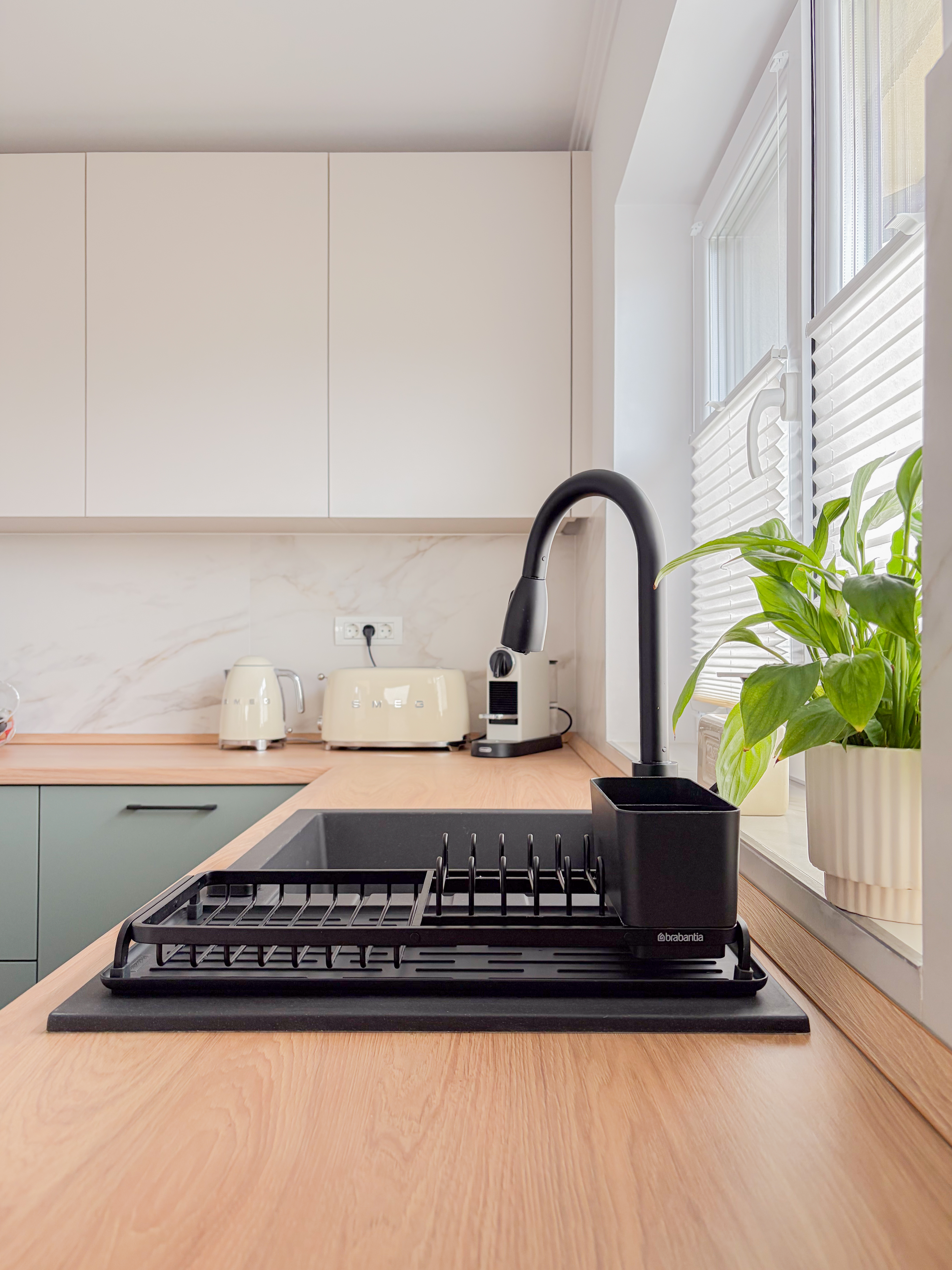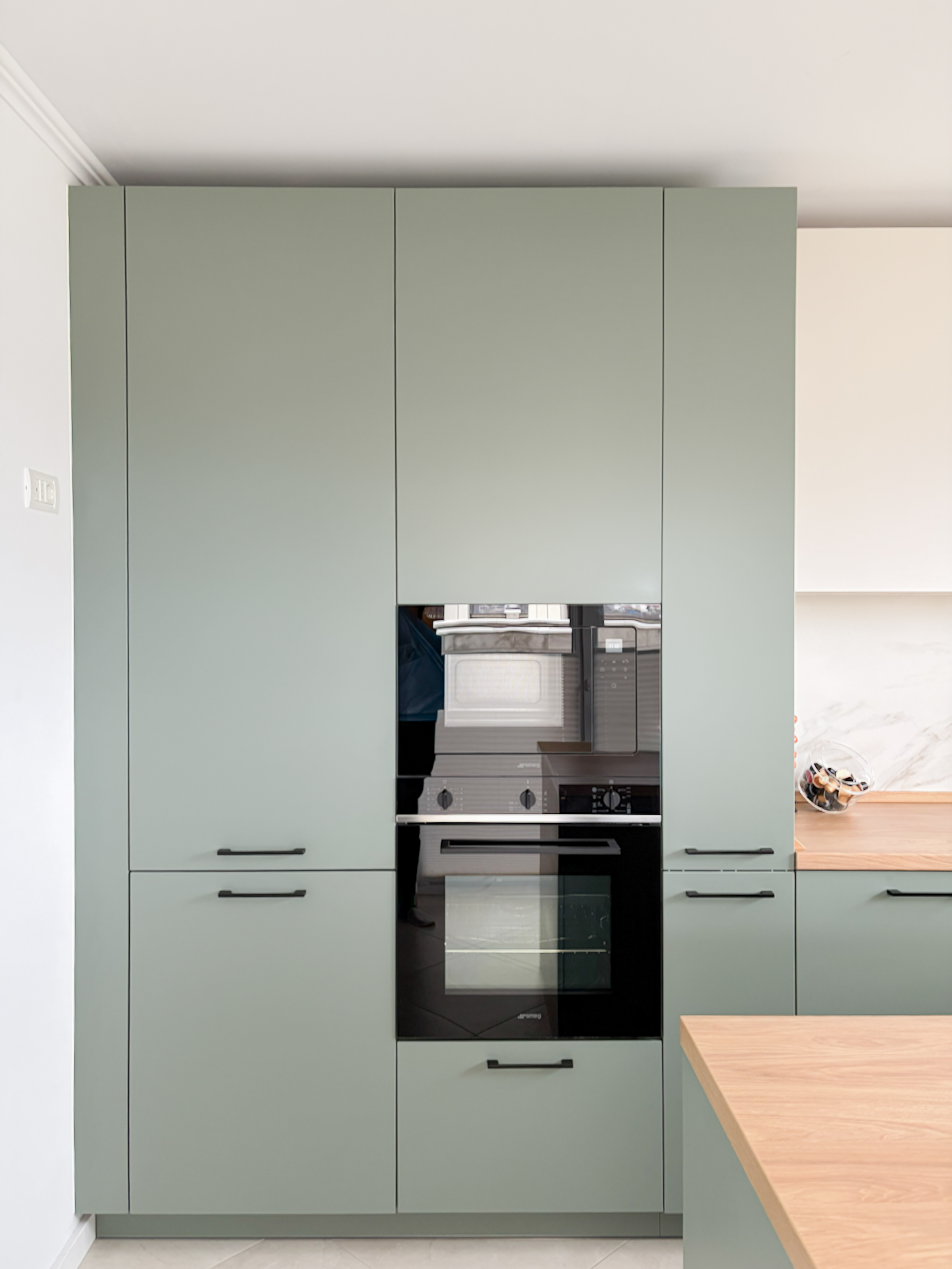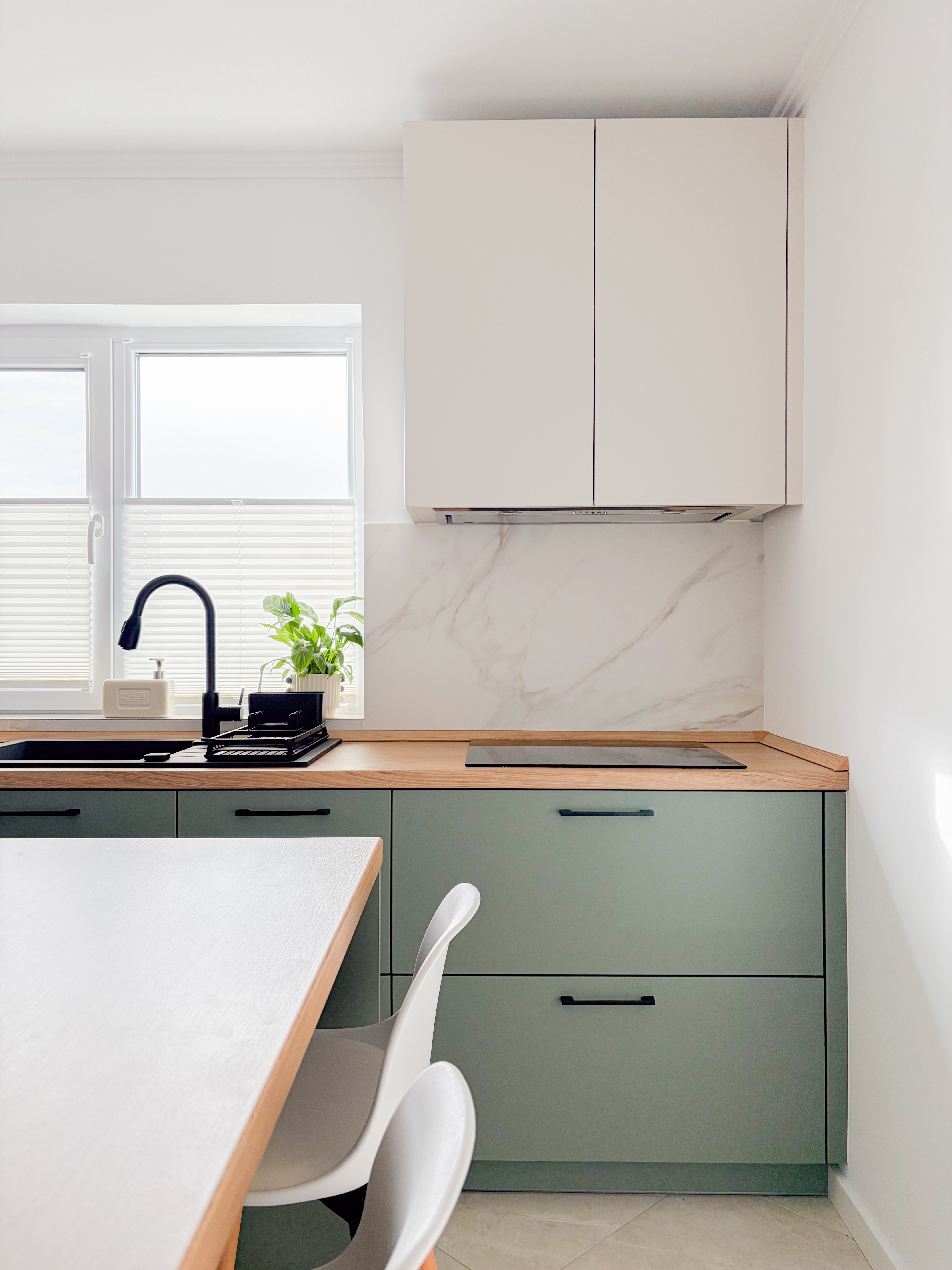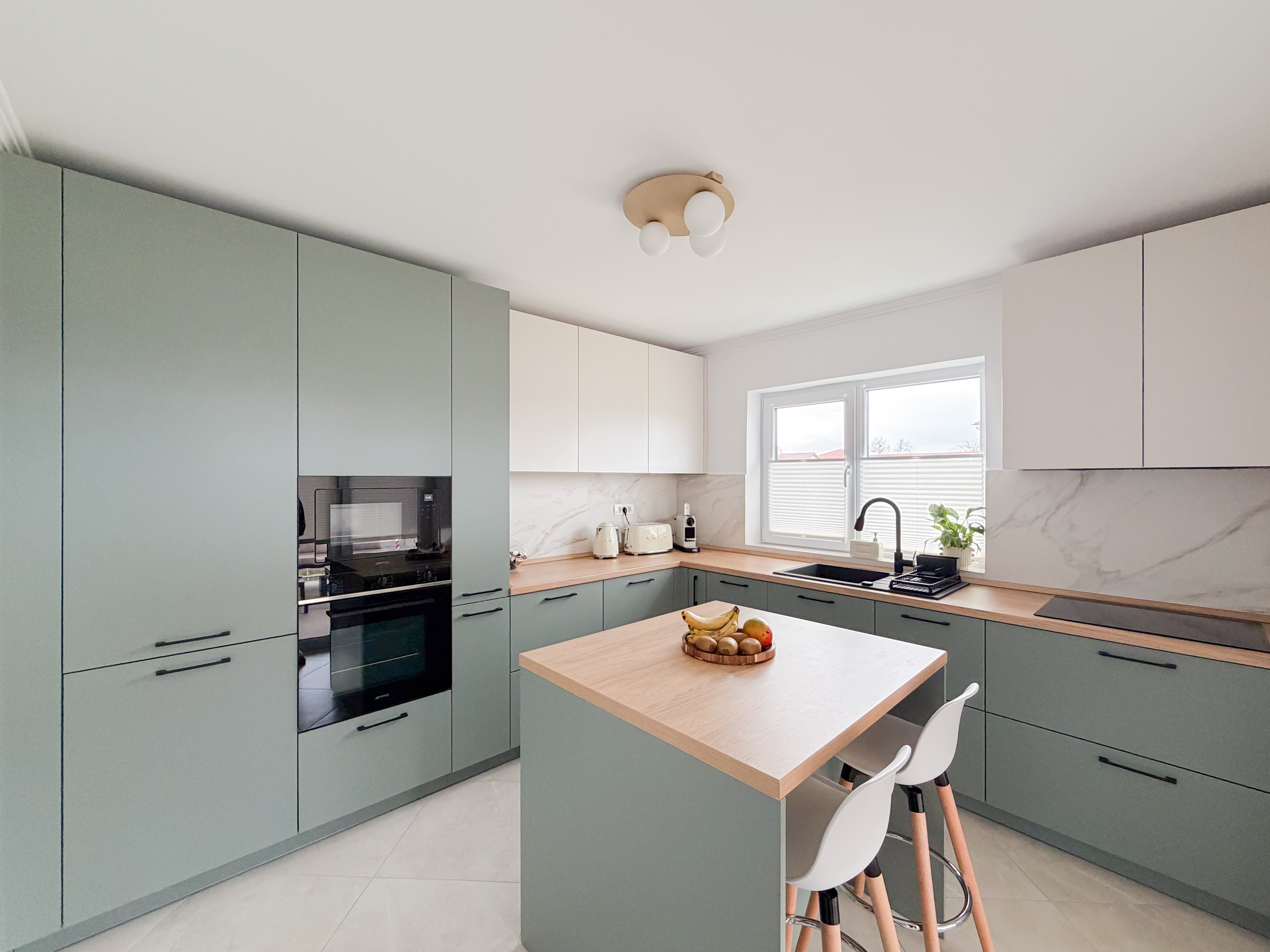 Bucătăria este configurată în formă de L, o soluție care permite valorificarea eficientă a spațiului și o organizare ergonomică a zonelor de lucru. Mobilierul, realizat într-o nuanță de verde eucalipt, aduce un plus de prospețime și rafinament. Materialele și finisajele alese susțin atât durabilitatea, cât și estetica minimalistă a amenajării. Integrarea unei insule completează funcționalitatea bucătăriei, facilitând extinderea zonei de preparare, dar și crearea unui spațiu informal pentru servirea micului dejun, brunch-ului sau a meselor rapide.