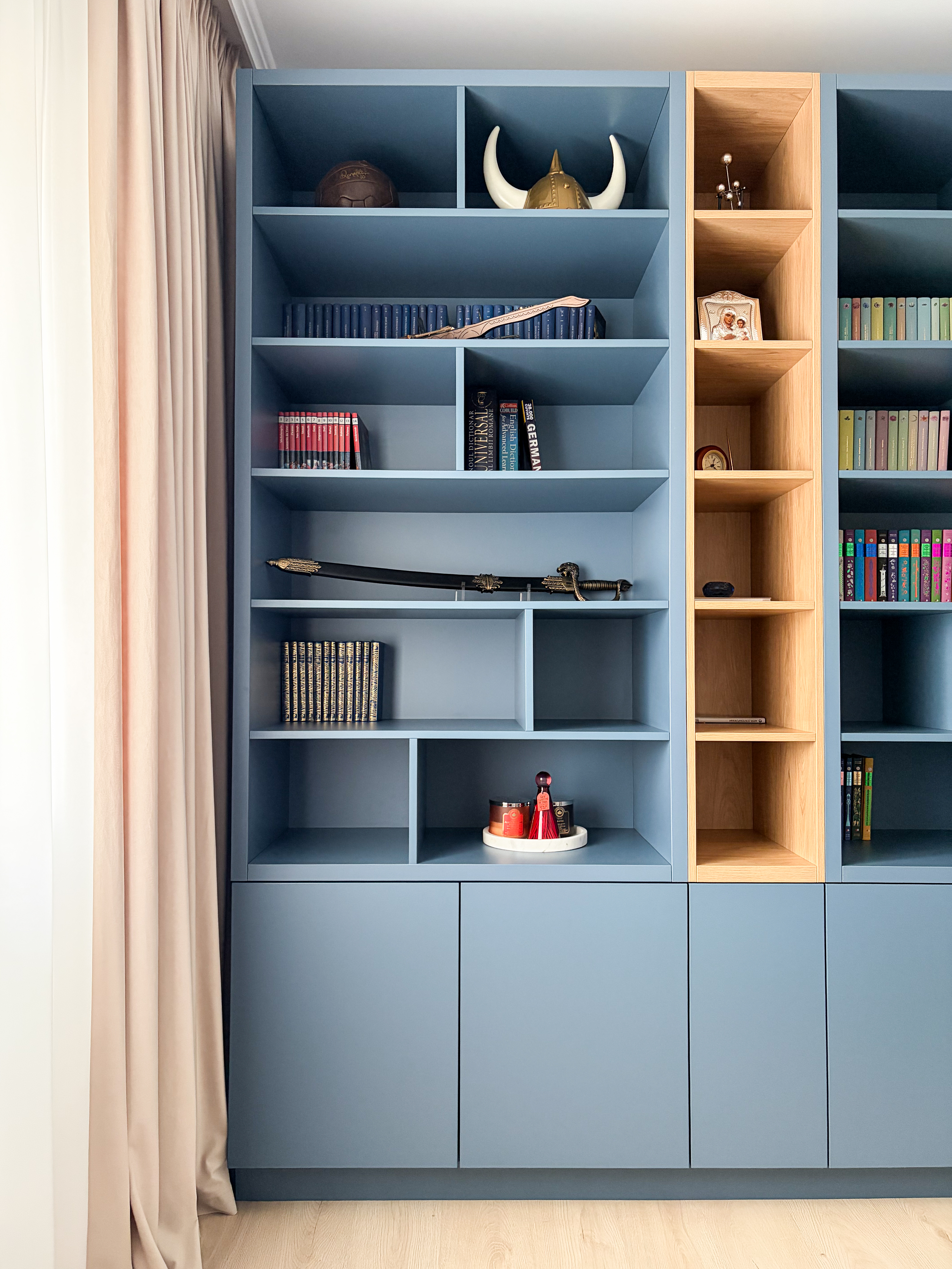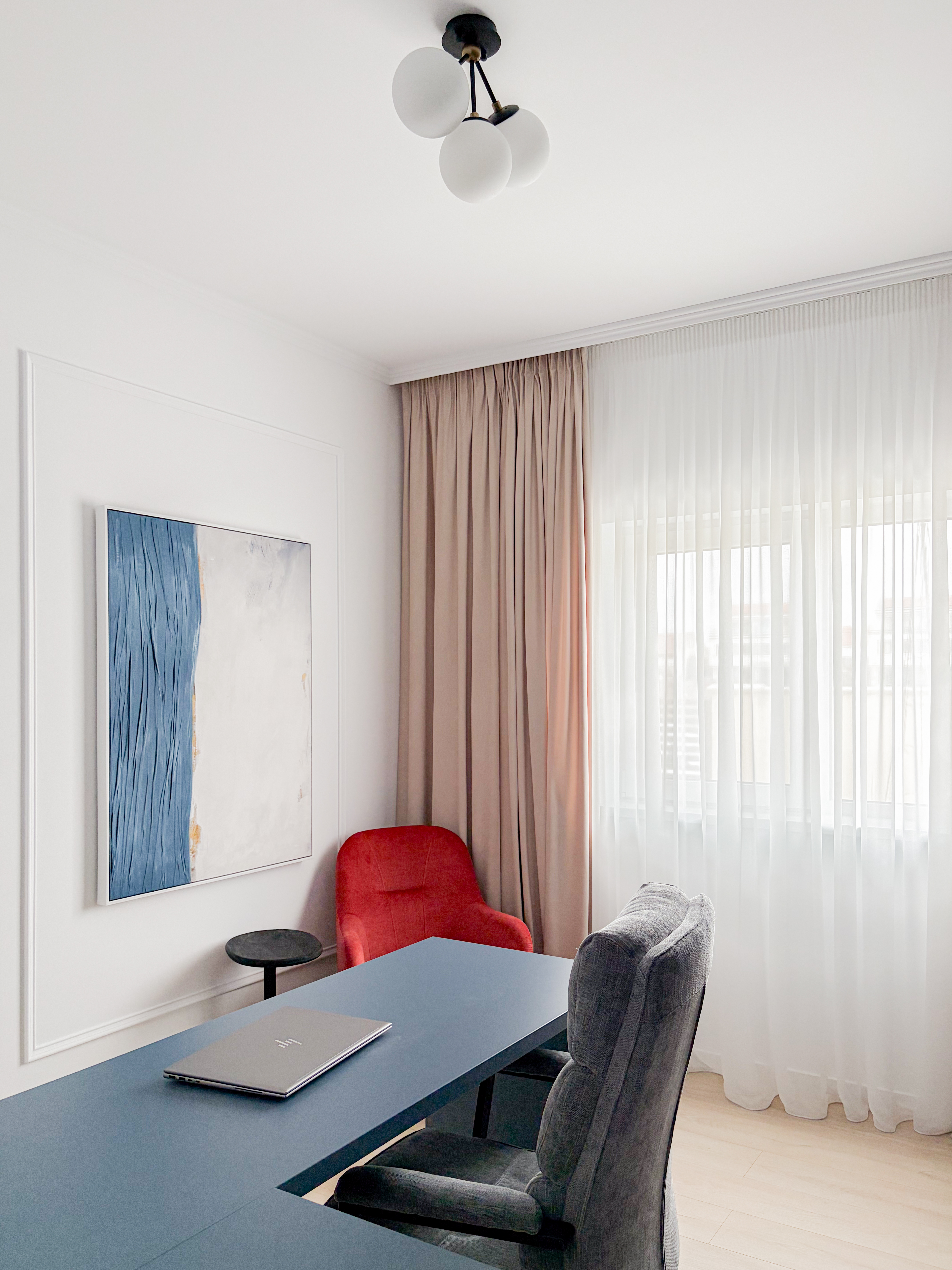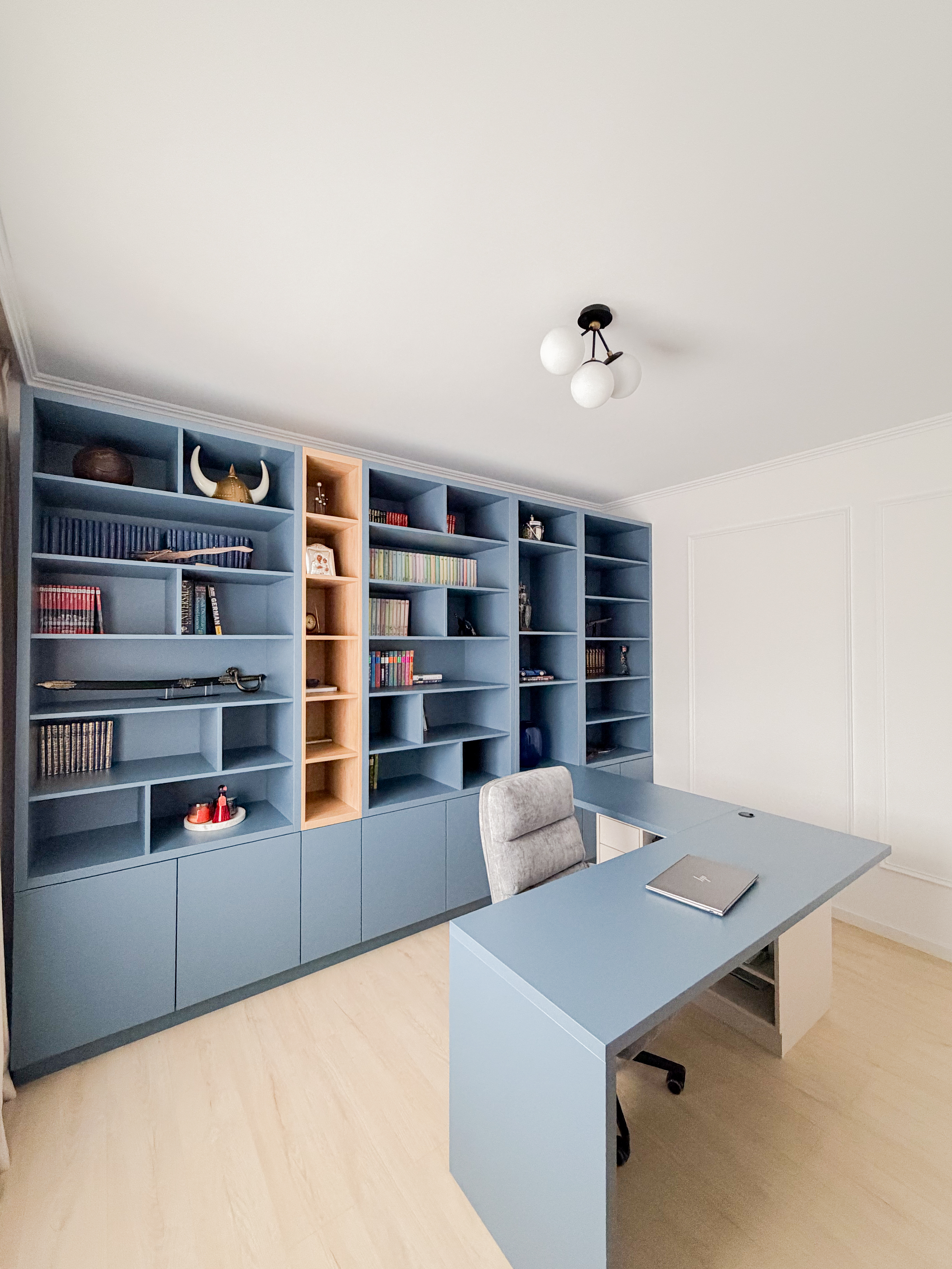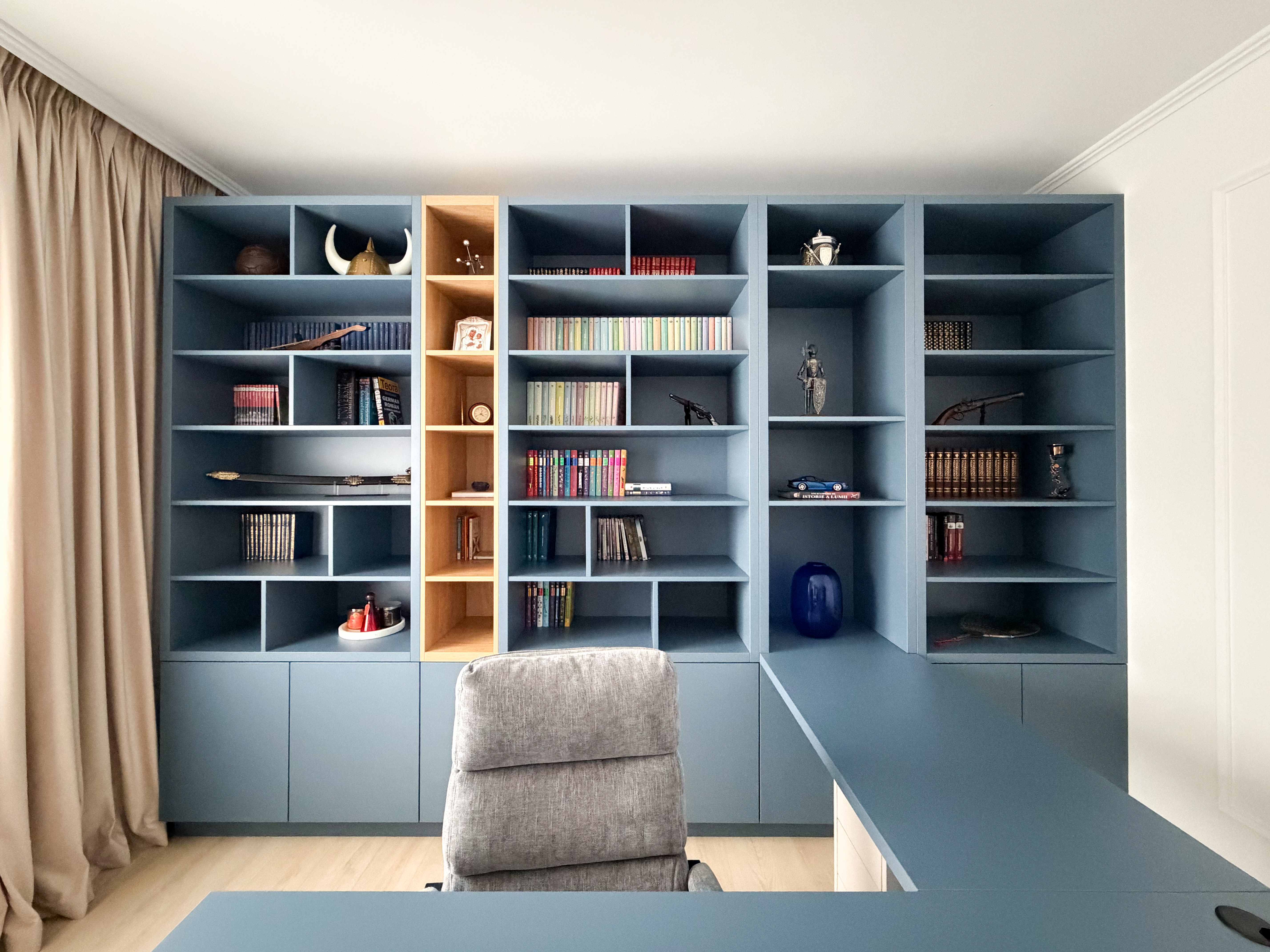 Amenajarea biroului este construită în jurul unei biblioteci realizate la comandă, care devine elementul central al spațiului atât din punct de vedere estetic, cât și funcțional. Culoarea albastru ocean aleasă pentru mobilier adaugă profunzime și eleganță, fiind integrată într-o abordare minimalistă.Din punct de vedere practic, biblioteca este concepută pentru a susține eficient zona de lucru, integrând un spațiu dedicat pentru utilizarea laptopului, depozitare organizată și acces facil la obiectele necesare activităților zilnice. Astfel, designul nu este doar unul estetic, ci răspunde direct cerințelor funcționale ale unui birou modern.Contrastul cromatic este accentuat de fotoliul în nuanță oranj, care aduce un plus de dinamism și căldură vizuală spațiului.