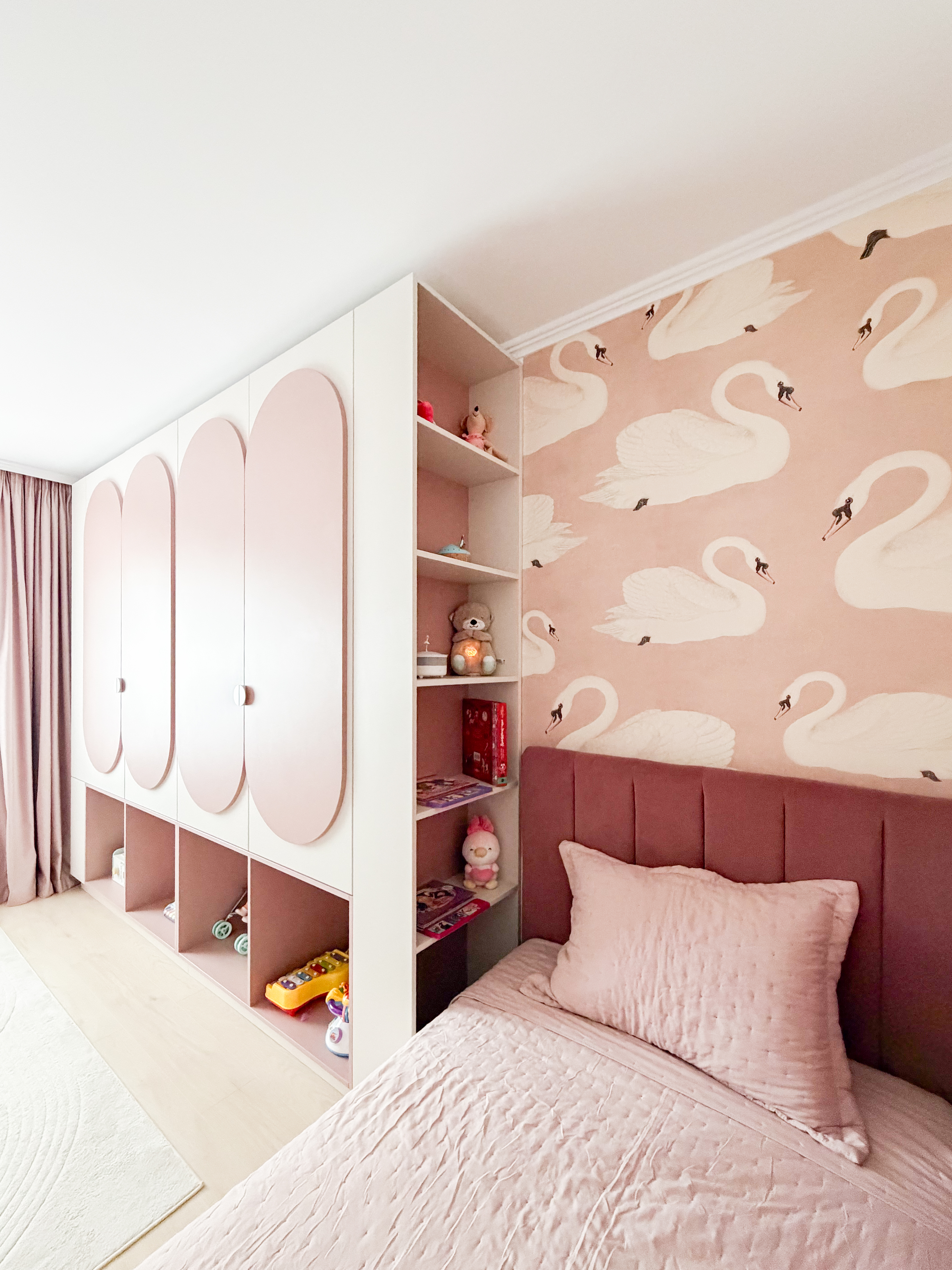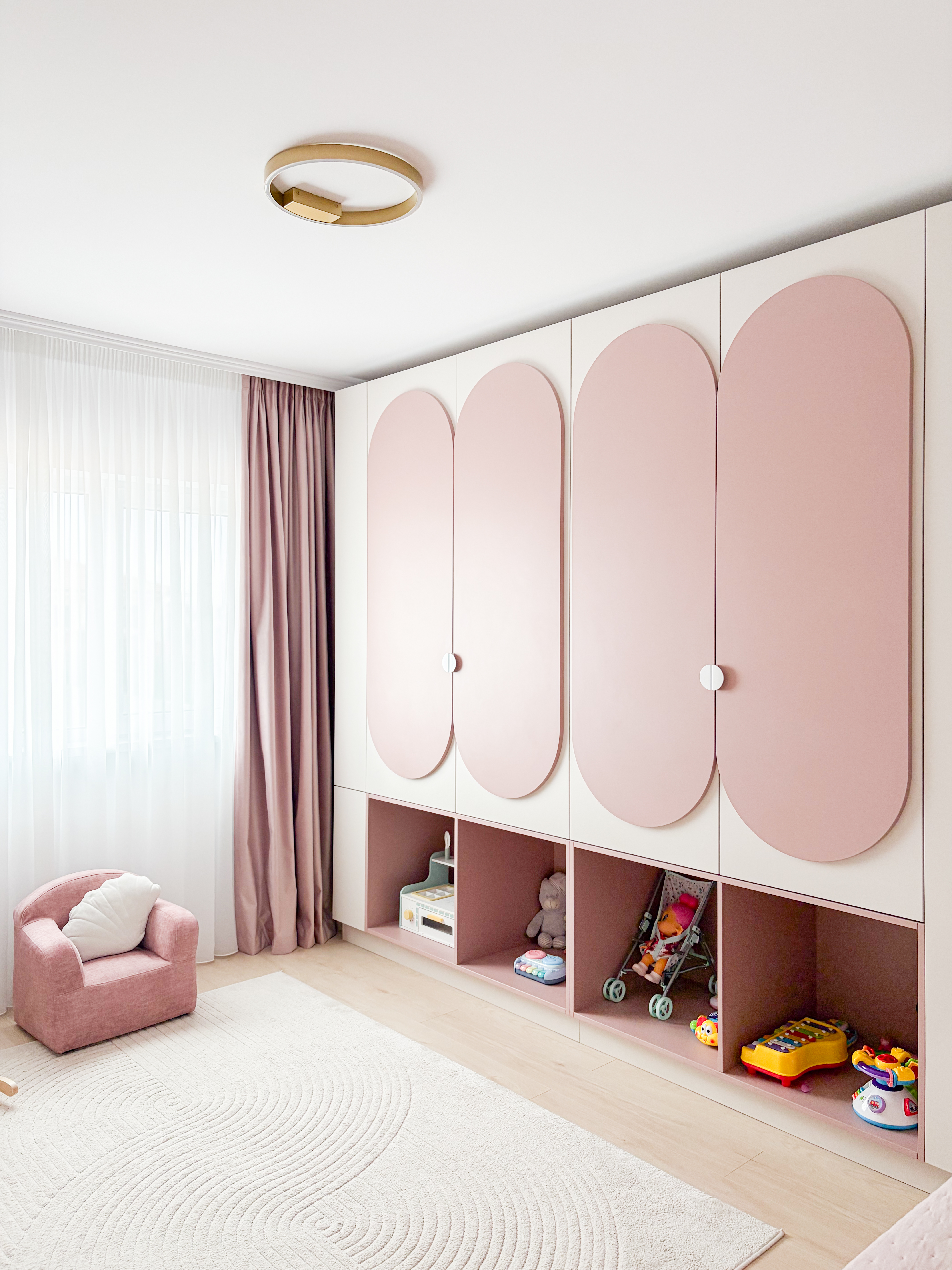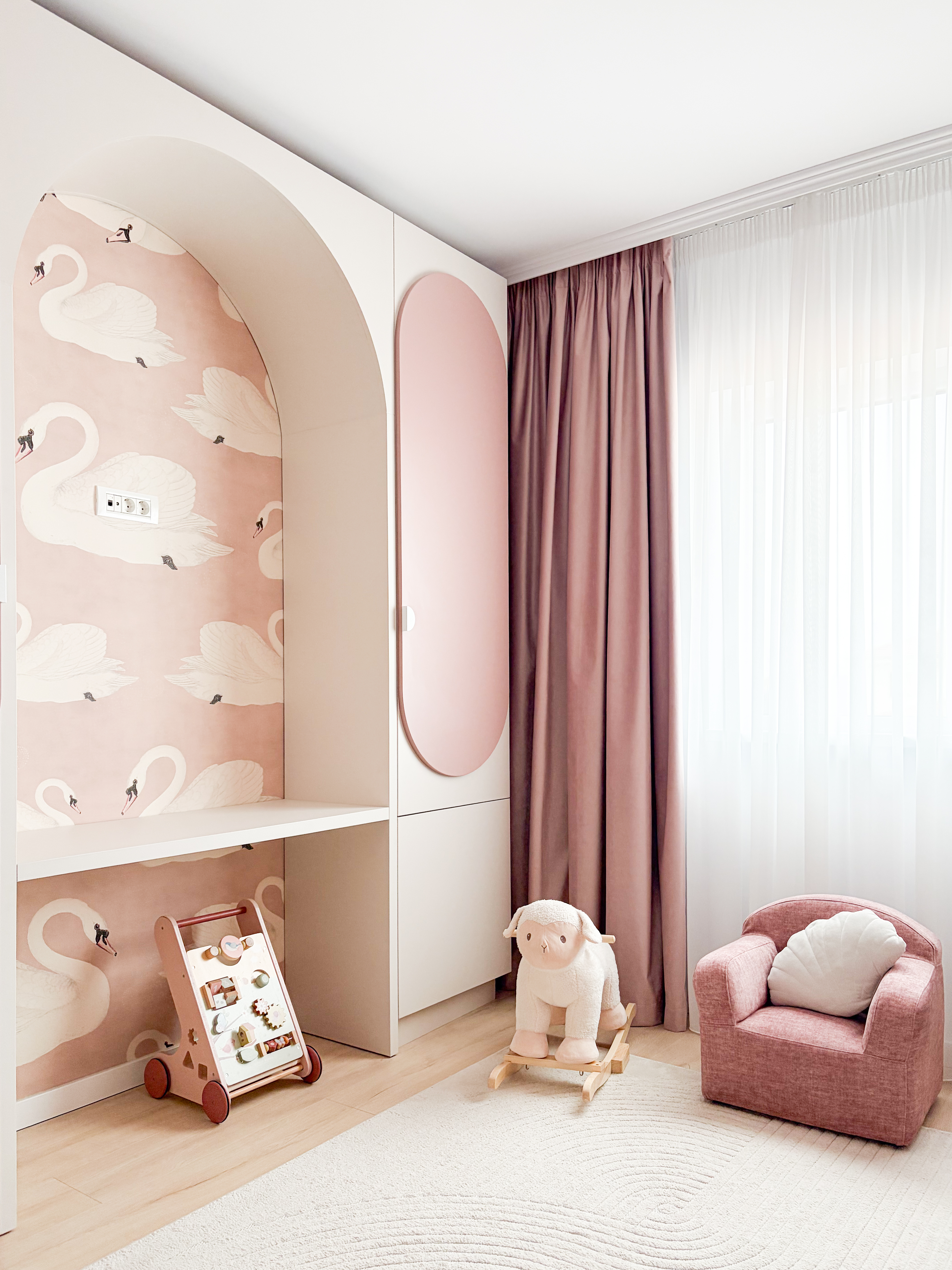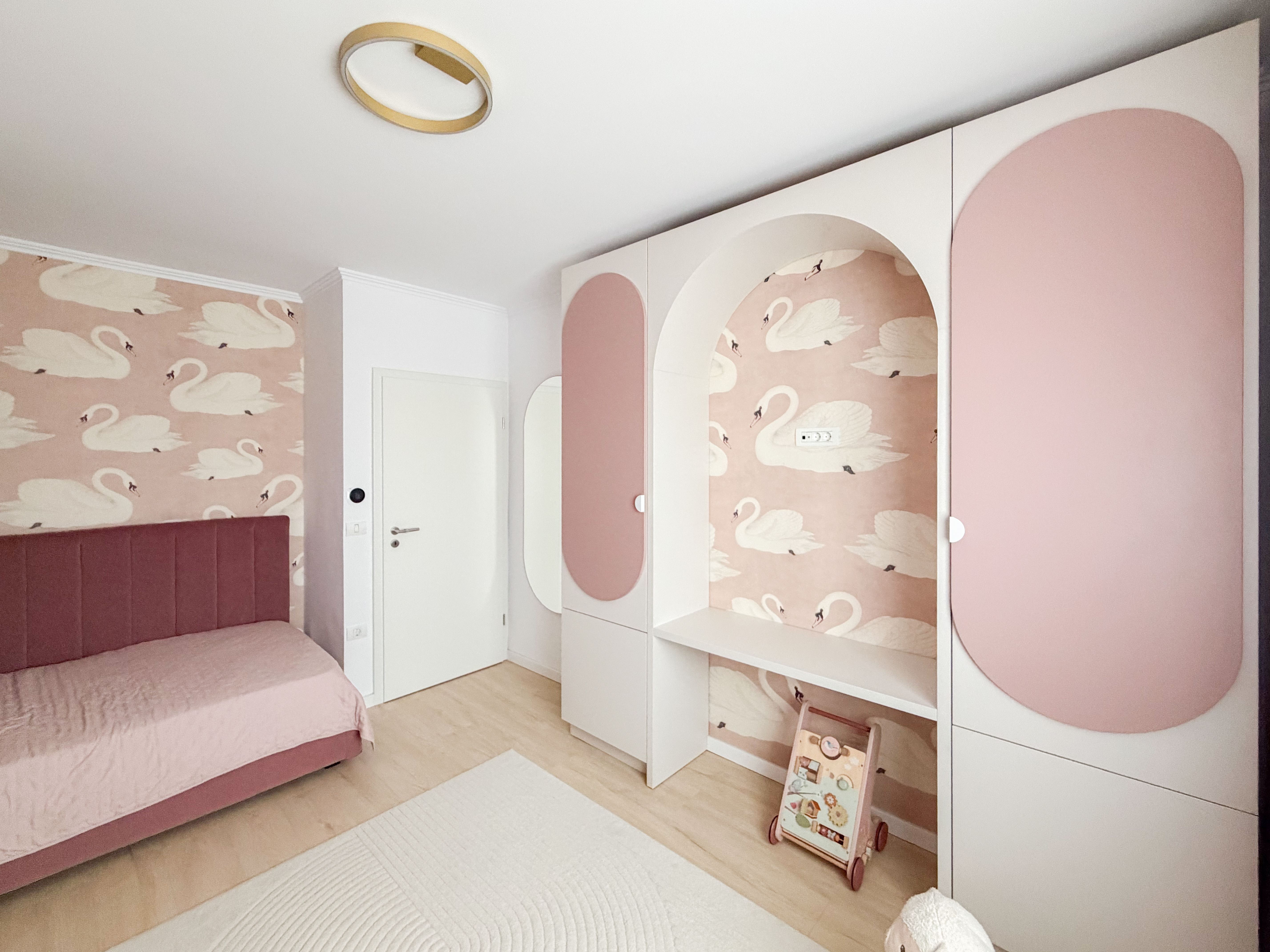 Camera de copil a fost concepută ca un spațiu cald și delicat, pentru o fetiță, în care estetica și confortul se completează armonios. Paleta cromatică este dominată de nuanțe de bej și rose pal, alese pentru a crea un ambient luminos, calm și prietenos. Un accent important a fost pus pe designul mobilierului, care se remarcă prin forme rotunjite, integrate punctual pentru a fluidiza cadrul vizual și a adăuga o notă jucăușă și primitoare. Aceste volume moi contribuie la un spațiu sigur, dar și estetic, potrivit universului copilăriei. Întregul ansamblu rezultă într-o cameră echilibrată, armonioasă și personalizată, în care cromatica, formele și materialele susțin o atmosferă plăcută, stimulativă și adaptată nevoilor unui copil.