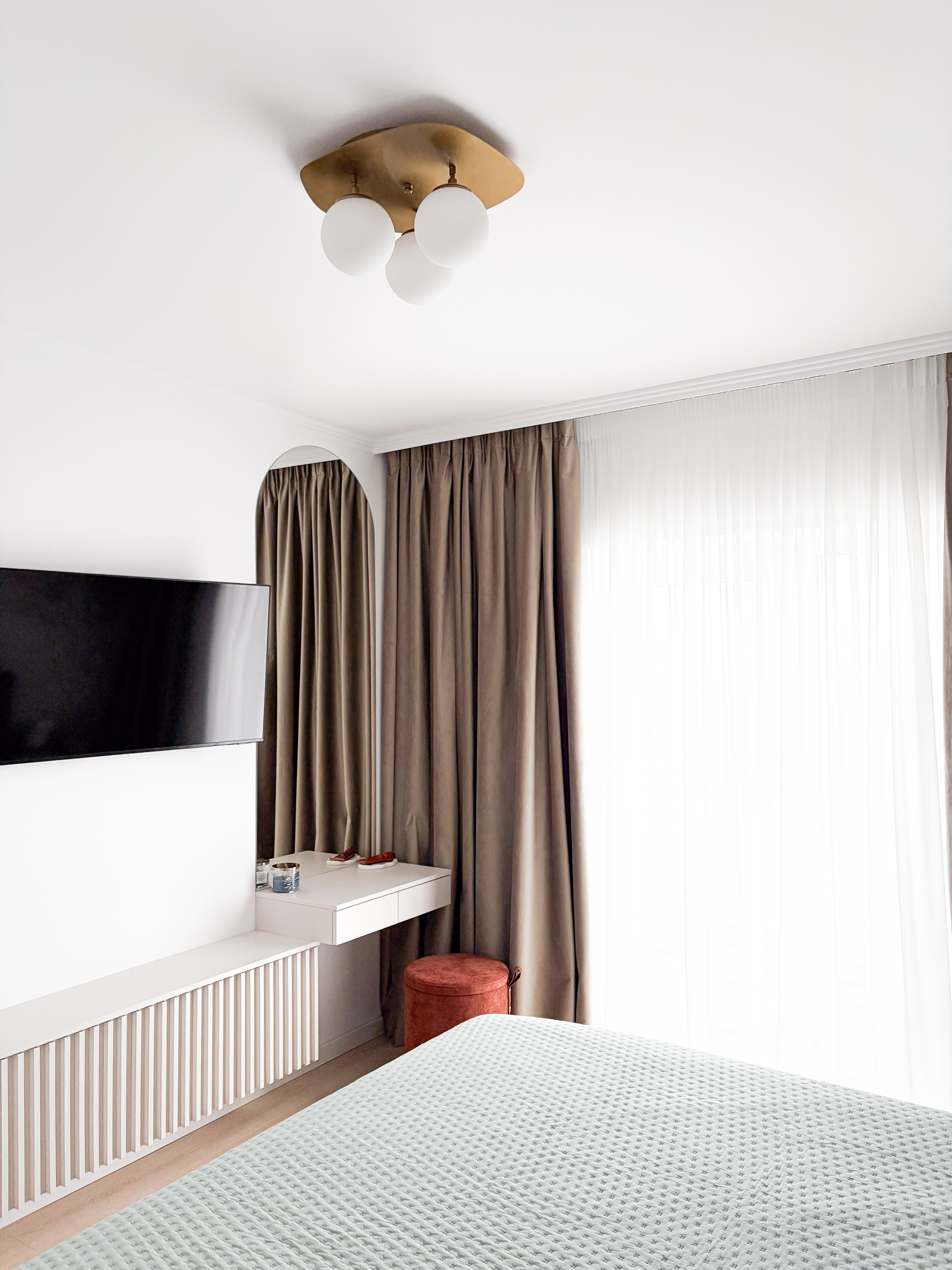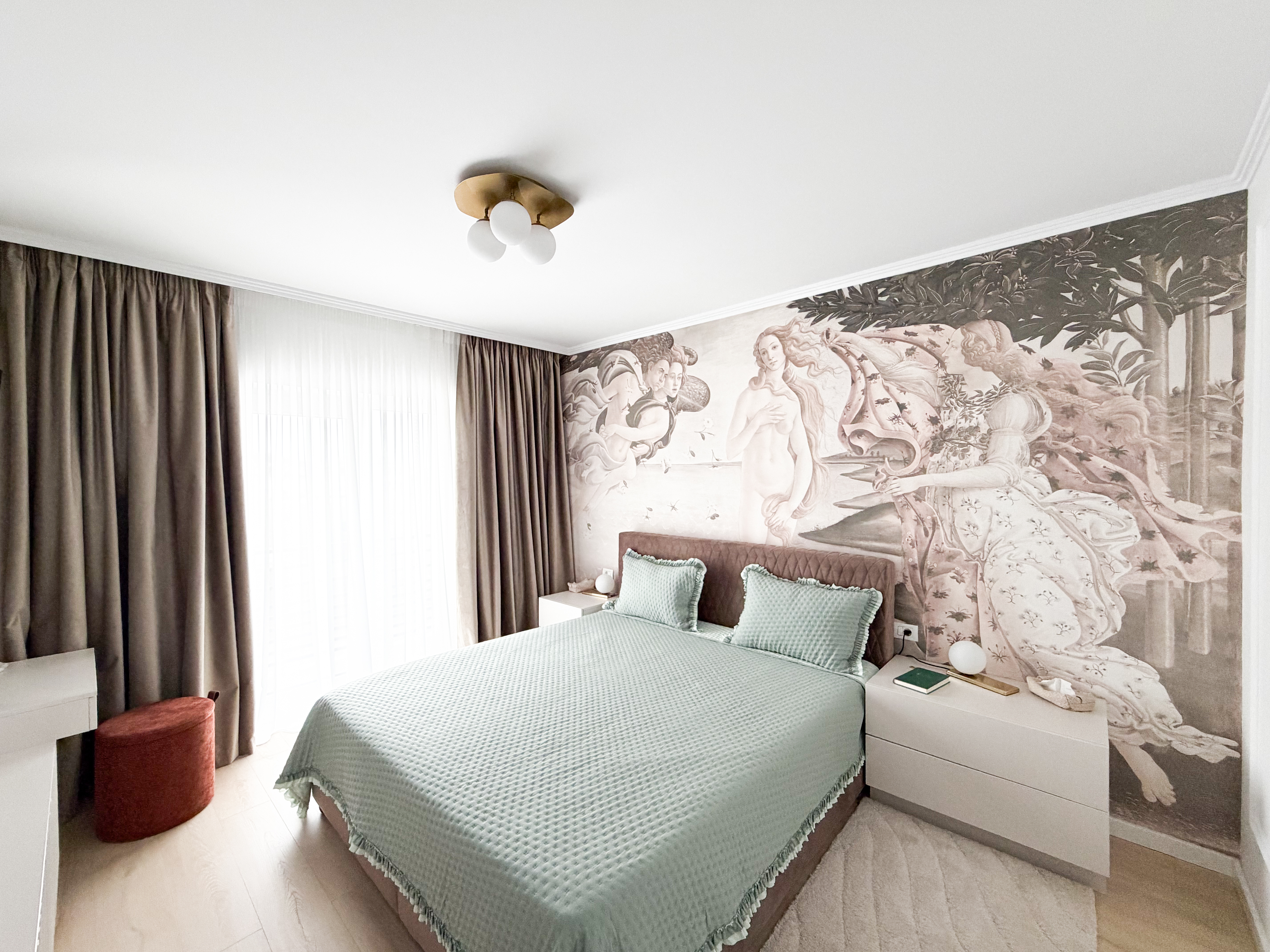 Dormitor matrimonial a fost conceput ca un refugiu intim, în care designul interior susține atât confortul zilnic, cât și expresia estetică a spațiului. Conceptul pornește de la o paletă cromatică caldă, echilibrată, în nuanțe neutre și accente pastelate, atent selectate pentru a induce o stare de calm și rafinament. Peretele accent este pus în valoare printr-un tapet statement inspirat din Nașterea Venerei de Sandro Botticelli, element care conferă identitate și profunzime vizuală dormitorului. Acest accent artistic este echilibrat prin mobilier cu linii curate, finisaje mate și texturi textile moi, creând un dialog coerent între clasic și contemporan. Zona de machiaj a fost integrată funcțional în ansamblul dormitorului, ca parte firească a rutinei zilnice, fără a fragmenta vizual spațiul.